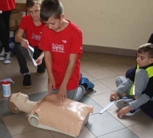 Po przyjeździe do szkoły wolontariusze, którzy należą do Szkolnego Koła PCK pod opieką koordynatora Elżbiety Plata uczestniczyli w pokazie udzielania pierwszej pomocy dla dzieci w oddziale przedszkolnym. Dzieci zapoznały się z numerami alarmowymi, dowiedziały się jak prawidłowo wykonać rozmowę wzywając karetkę do wypadku, poznały sposoby bandażowania ran oraz ćwiczyły układanie poszkodowanego w pozycji bezpiecznej i udzielanie RKO na fantomie.